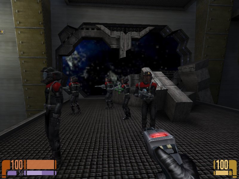 Unfortunately, the enemy AI is significantly less intelligent. It basically will stand in front of you and shoot. Except for a boss or two, the enemy does not dodge, strafe, or do anything fancy. Another somewhat annoying point is the enemy AI will ignore your team for the most part and go straight for you. The only nifty feature of the AI is its tendency to run off and look for buddies to help defeat you. I'd try to hide behind my team at times, the enemy would actually stop shooting sometimes since it didn't have a clear shot at me. I suppose Raven didn't want you getting pulverized by the teammate AI. They want the general public to be able to handle this, not just the hardcore UT/Counterstrike/Quake III players.